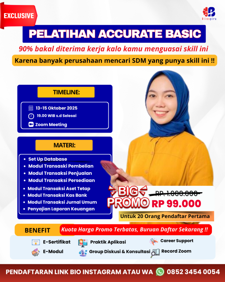 Pelatihan ini sangat cocok bagi mahasiswa atau alumni jurusan akuntansi, manajemen, perpajakan, bidang ekonomi lainnya dan para karyawan/ pelaku usaha yang ingin UPGRADE SKILL APLIKASI ACCURATE